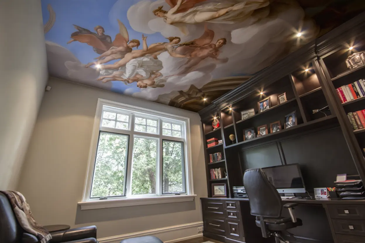 Візуальна Корекція Простору: Правильно підібраний малюнок на стелі може візуально змінити сприйняття кімнати: зображення неба зробить стелю “вищою”, перспектива додасть глибини, світлі візерунки розширять простір.