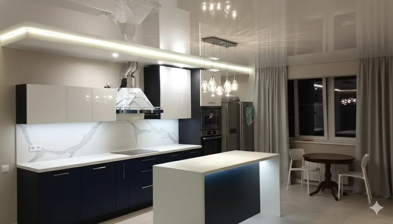 Так, глянцеві полотна чудово комбінуються з іншими текстурами — наприклад, з матовими або сатиновими у дворівневих конструкціях. Також популярні рішення: інтеграція зі світловими лініями, парящими профілями або прихованими карнизами.