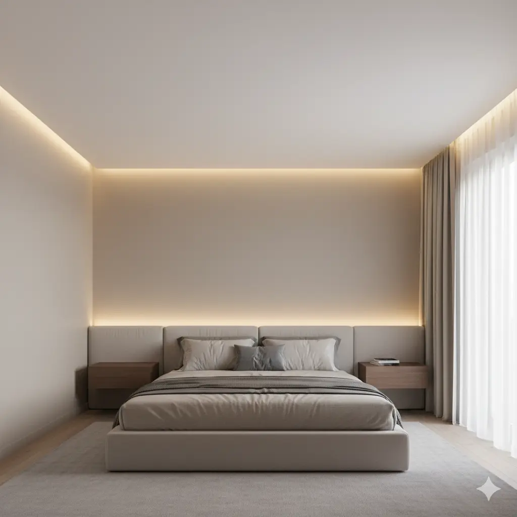 Візуальна Корекція Простору: Світловий ореол по периметру візуально розширює межі кімнати та може зробити низьку стелю візуально вищою. Це ефективний прийом для дизайну інтер’єру невеликих приміщень.