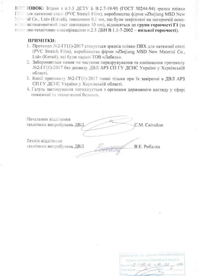 Цей документ від ДСНС підтверджує, що наші ПВХ-плівки мають клас горючості Г1. Простими словами — вони **не підтримують горіння** і є абсолютно безпечними для використання у житлових приміщеннях.