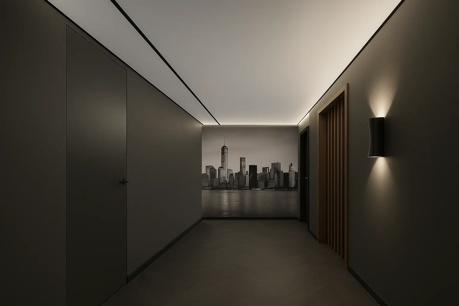 На відміну від стандартних систем, цей профіль створює рівний, акуратний зазор (зазвичай 6-7 мм) між стіною та натяжним полотном. Це формує глибоку, чітку тінь, що повністю виключає необхідність у декоративних вставках чи багетах. Результат – ідеальна стеля без плінтуса, що виглядає мінімалістично та візуально “відірвана” від стін.